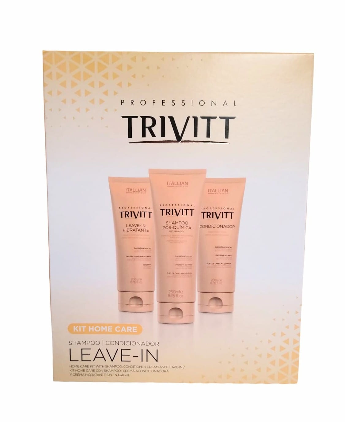 The Trivitt Moisturizing Leave In Kit is the perfect for anyone looking to maintain the health and beauty of chemically treated hair. Composed of three essential products, this kit offers complete care that restores, nourishes and protects the hair, guaranteeing a healthy and full of life look. 1. Post-Chemical Shampoo: Developed especially for hair subjected to chemical treatments, this shampoo gently cleanses while repairing the damage caused by processes such as colouring, bleaching and straightening. Its formula rich in Vegetable Keratin helps strengthen the hair structure, restoring elasticity and resistance. 2. Conditioner: This conditioner works intensely to detangle and condition the hair, providing deep hydration. Enriched with Golden Camelina Oil, it is able to seal the cuticles, adding shine and softness, as well as providing an extra layer of protection against external damage. 3. Moisturizing Leave-In: The final step to perfectly groomed hair, this moisturizing leave-in offers long-lasting hydration without weighing it down. The combination of Vegetable Keratin and Golden Camelina Oil in its formulation leaves hair soft, manageable and with a spectacular shine, as well as making it easier to comb and protecting it from the heat of a hairdryer and flat iron. The synergy between Vegetable Keratin and Golden Camelina Oil in this kit provides intensive recovery, promoting healthy hair from root to tip. Ideal for regular use, the Trivitt Maintenance Kit with Moisturizing is the right choice for those who don't give up on hair that is always beautiful, moisturized and full of life.