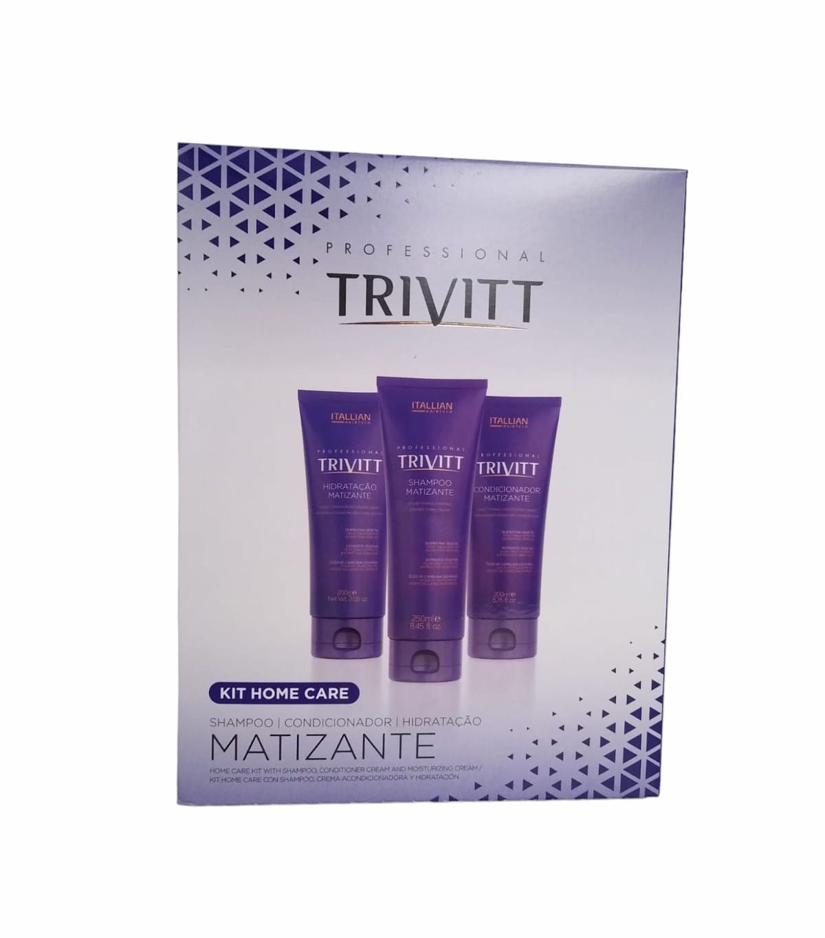 Trivitt Toning Intensively Moisturizing set for home care at home, ideal for blonde hair. Rich in wheat proteins, keratin, camelina, trehalose. The set includes: 1 x Trivitt Toning Shampoo 250ml, Trivitt Toning shampoo is recommended for blonde hair. Neutralizes yellow shades of hair, restores its platinum shine and provides antioxidant protection. It contains active ingredients that maintain the luminous and ash shade of blonde, at the same time protecting against factors causing oxidation of the pigment inside the hair and preventing the appearance of discoloration. 1 x Trivitt Toning Conditioner 200 ml, Trivitt Toning Conditioner is recommended for blonde hair. Neutralizes yellow shades of hair, restores its platinum shine and provides antioxidant protection. It contains active ingredients that maintain the luminous and ash shade of blonde, while protecting it against factors causing oxidation of the pigment inside the hair and preventing the appearance of discoloration. 1 x Trivitt Toning Moisturizing Cream 200 ml, Trivitt Intensively Moisturizing Toning Mask. Immediate results: gently neutralizes yellow tones, nourishing and protecting the color.